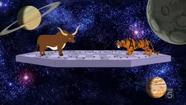 Bevo faces off against the unnamed Clemson Tiger when Cleveland Brown Jr. tries to figure out a hypothetical battle between the two in "March Dadness". Bevo loses when his weight causes him to fall of the floating spiked platform from Flash Gordon into space.